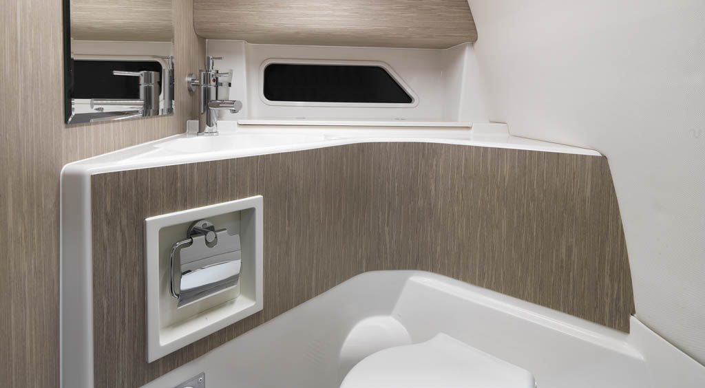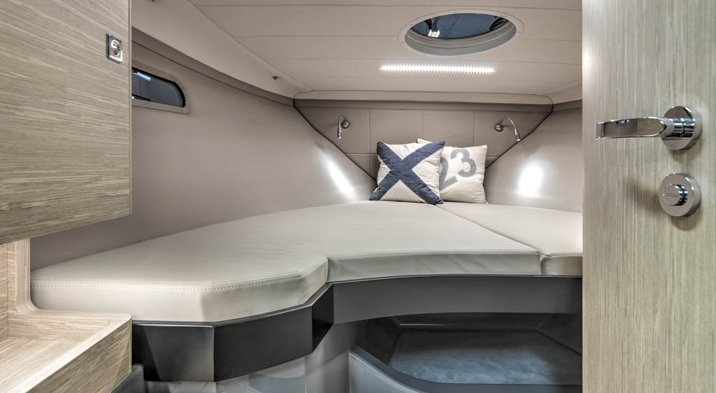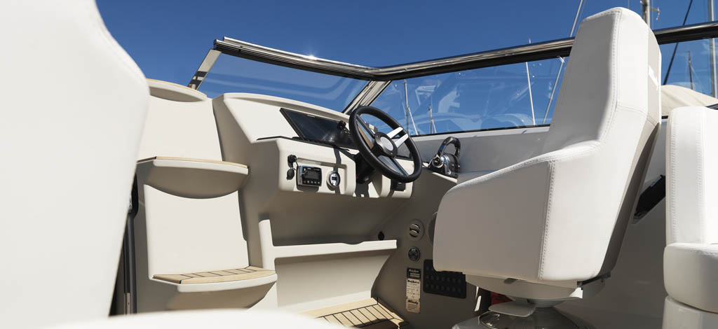 Conceived primarily as a dayboat, she has a practical two-berth cabin and head compartment tucked under the foredeck. Her deep, safe cockpit is both social and versatile, with a moveable aft sunbed, and can be easily protected with her new generation canopy system or bimini sun-shade.